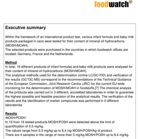 10月24日,food watch在官網(wǎng)公布了上述結(jié)果,并稱在嬰幼兒產(chǎn)品的整個(gè)生產(chǎn)鏈條中,都可能受到礦物油的污染。此次檢測發(fā)現(xiàn)的物質(zhì)為非純礦物油成分,有可能是從包裝金屬罐遷移到奶粉中的。