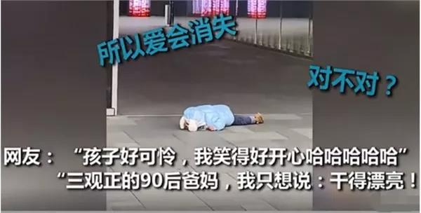 一旁站著的父母,不動(dòng)聲色,抱著膀子冷眼旁觀,表現(xiàn)得不慌不忙,不僅不像其他父母那樣趕緊去扶孩子起來,反而在一旁起哄:"你哭你的,我們就靜靜地看著,等你哭累了我們再回家哦。"