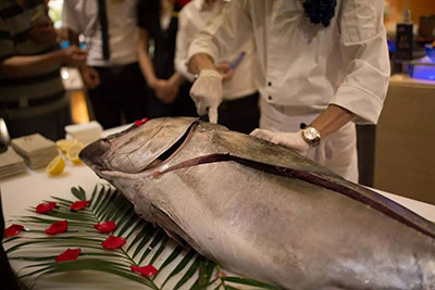 金槍魚肉質(zhì)柔嫩、鮮美,蛋白質(zhì)含量很高,富含DHA、EPA等具有生物活性的多不飽和脂肪酸、?;撬?、礦物質(zhì)和維生素的含量豐富,是國際營養(yǎng)協(xié)會推薦的綠色無污染健康美食。