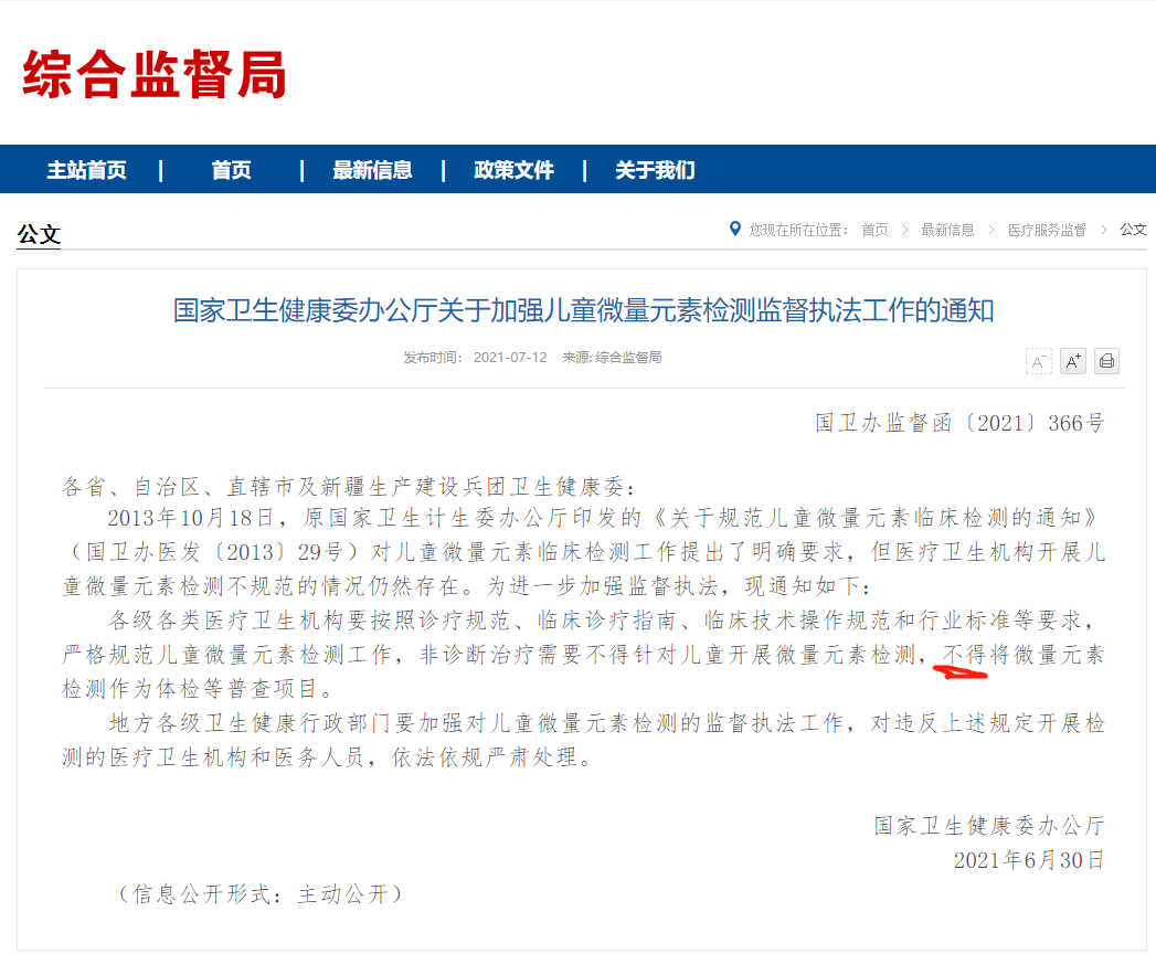 前一則是2013年發(fā)布的,也就是說(shuō)8年前國(guó)家衛(wèi)計(jì)委已經(jīng)叫停了微量元素的檢查,但是還是有很多機(jī)構(gòu)無(wú)視禁令,繼續(xù)做微量元素檢查,于是,2021年國(guó)家再一次的發(fā)布公文再次叫停該項(xiàng)檢查。