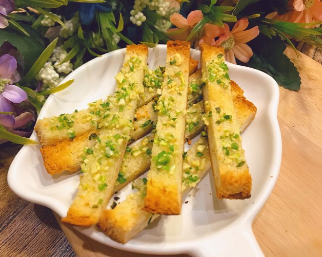 3、用刷子將調(diào)好的醬刷在面包條上,放進(jìn)預(yù)熱好的烤箱中180度烤8分鐘左右就好了。