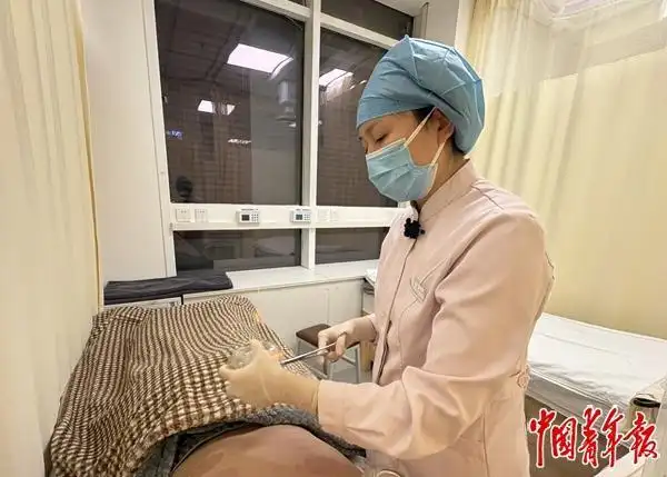北京按摩醫(yī)院,護(hù)士正給年輕患者拔罐。中青報(bào)·中青網(wǎng)記者 劉昶榮/攝