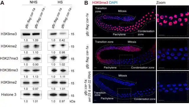 西湖實驗室申恩志團隊以秀麗隱桿線蟲為模型發(fā)現(xiàn),在精子形成的關(guān)鍵階段(粗線期),高溫會顯著影響精細胞的表觀遺傳標記H3K9me3——這種被稱為“基因開關(guān)”的組蛋白修飾,決定著哪些基因該開啟或關(guān)閉。