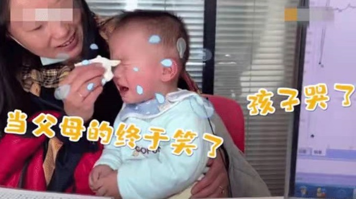 媽媽笑著趕緊用紙巾著給寶寶擦眼淚,還輕輕拍著寶寶的后背安慰他的情緒。可是媽媽的心情也不平靜,臉上帶著笑,嚴重卻也出現(xiàn)隱隱的水光。