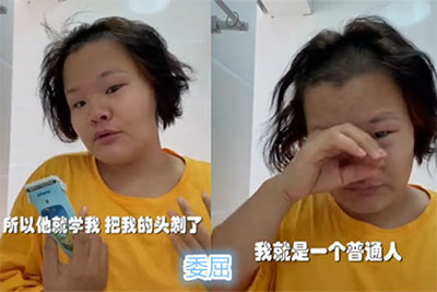 很快他就發(fā)現(xiàn)自己的頭發(fā)被剃掉了,做這件事情了,正是自己家的熊孩子。從視頻截圖可以看出,這位媽媽的臉上寫滿了“心累”,眼圈還有些泛紅。她額頭前的頭發(fā)幾乎全部被剃掉了,光禿禿的一大片。