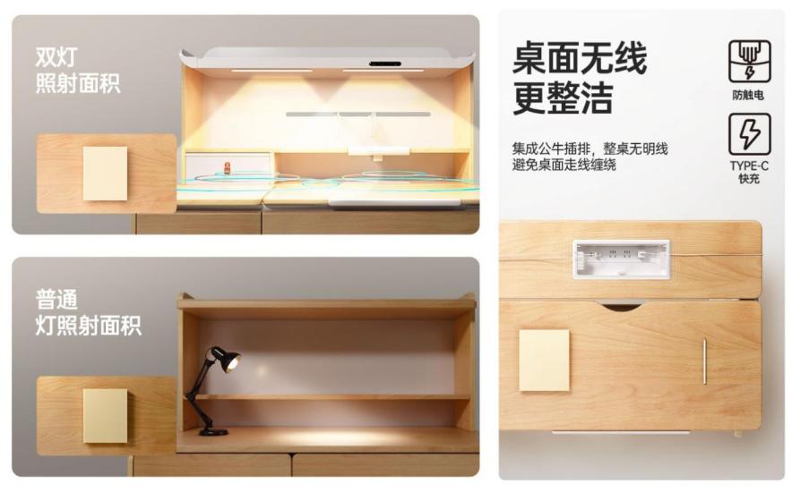 在功能設計上,黑白調S2學習艙的集成功能極為巧妙,為學習創(chuàng)造了更輕松、更專注的氛圍。其嵌入式護眼燈采用偏光專利技術,覆蓋整個桌面,最大程度上消除了視覺疲勞帶來的不適感,讓學習更為舒適。同時,桌面集成插排的設計使得插線整齊有序,不僅美觀大方,更增加了使用的便捷性。