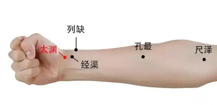 太淵穴,在腕橫紋拇指?jìng)?cè)。揉按3分鐘,可補(bǔ)益肺陰,緩解燥咳。