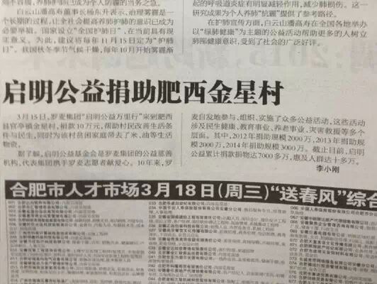 2015年3月15日,北京羅麥科技有限公司、啟明公益基金會聯(lián)合合肥肥西縣扶貧辦、肥西縣財政局、官亭鎮(zhèn)等相關(guān)部門在安徽省合肥市肥西縣金星村村委支部舉行了一場簡短而有意義的捐贈儀式。