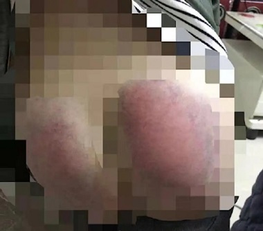 從圖片我們能看到小女孩的屁股已經(jīng)青紫了,竟然是用帶有小齒的板子打的,這得是多大的仇怨才對一個6歲小女孩下如此重手?