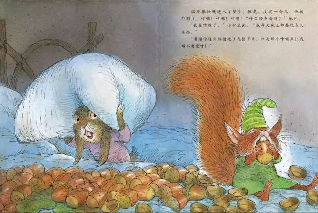 《溫尼想換個(gè)地方睡覺》是從一張床開始的:“小兔溫尼獨(dú)自坐在自己的小床上……”孤單的溫尼需要找個(gè)好伙伴一起睡覺,伙伴們都熱情地接納了他,可是最后溫尼還是回到了自己的床上,那里沒有松鼠的咔嘣聲,沒有臭鼬的怪味兒,沒有刺猬的刺,沒有熊的呼嚕聲,沒有貓頭鷹家的亮光,他終于放松地呼呼大睡了。