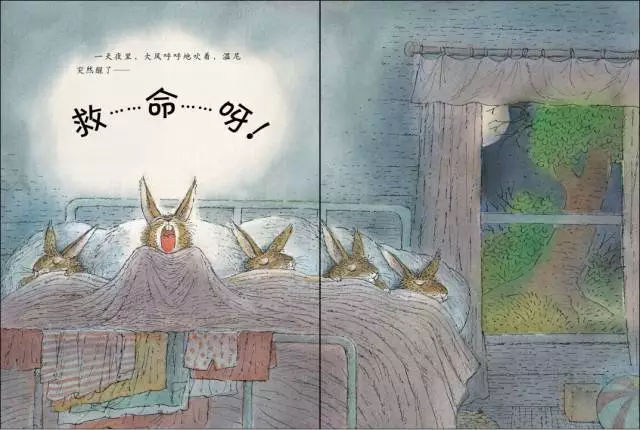 接下來的《溫尼和100只大灰狼》,不禁會(huì)讓爸爸媽媽彎起嘴角,因?yàn)楹芏嘈∨笥讯紩?huì)在被窩里想象出許多的大怪物。“有一百只大灰狼在追我!”“肚子餓得咕咕叫的狼!”“他們還長著好大的嘴巴呢!”受到驚嚇的溫尼和他的兄弟姐妹輾轉(zhuǎn)難眠,接下來的情節(jié)也許只有在童話中才會(huì)出現(xiàn)——勇敢的兔媽媽憑借一把掃帚就把100只狼趕跑了。
