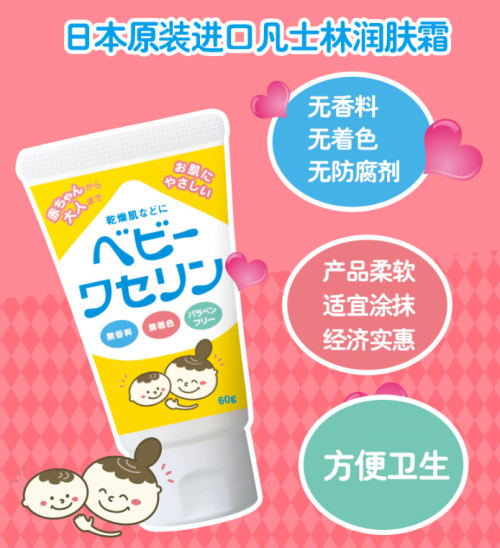 *以上圖片為在日本銷售的嬰兒凡士林潤膚霜,文中提到的“凡士林潤膚霜”是此產(chǎn)品的中國版包裝。