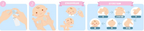 沐浴后五分鐘內(nèi)做保濕護(hù)理效果較好,MIKI HOUSE寶寶精油配合10種天然植物油,輔助未成熟的皮脂膜,調(diào)整寶寶肌膚。質(zhì)地易吸收不粘膩,按壓2、3下,然后給寶寶均勻涂抹即可。還可浸潤棉花、棉簽等,用來清潔耳蝸內(nèi)與肚臍周圍的污垢。按摩時順序可參照上圖。