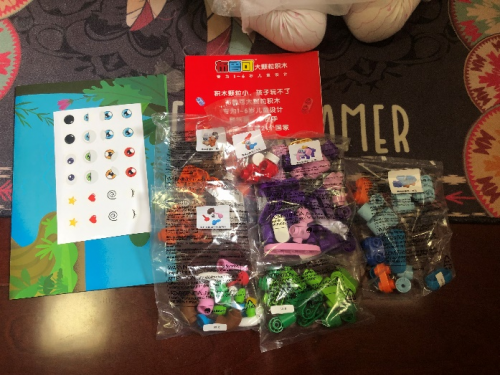 此時(shí)除了硬塑料的積木模塊,還發(fā)現(xiàn)了一袋例如眼睛、腳、 尾巴和翅膀等特征軟膠大顆粒積木,這些模塊能快速搭出可愛的動(dòng)物形象,拼裝起來就更有意思啦!
