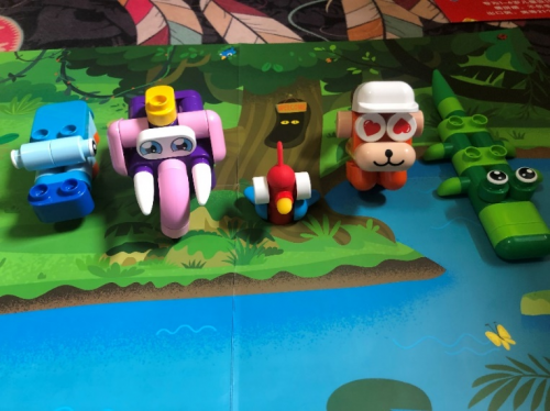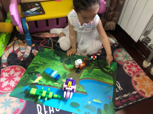 玩具拼裝解釋圖的背面就是地圖,給積木玩偶提供了生存場地,可以幫助寶寶辨知不同動(dòng)物的棲息環(huán)境。另外,處在1-6歲的孩子是非常喜歡進(jìn)行角色扮演的,你看把所有動(dòng)物拼裝好后,放在地圖上集合,她不僅給動(dòng)物們找到了各自的家,而且一部自編自導(dǎo)自演的故事大片就要開始了……