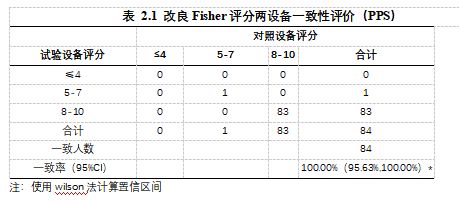 試驗設(shè)備與對照設(shè)備改良Fisher評分一致率的雙側(cè)95%置信區(qū)間的下限為95.63%,大于預(yù)定目標值85%,說明試驗設(shè)備與對照設(shè)備一致性達到要求。見表2.1。