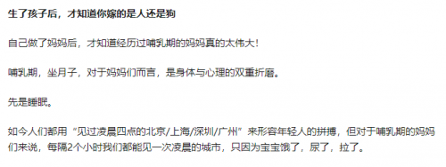 當(dāng)事人提到,哺乳期,坐月子,對(duì)于媽媽們而言,是身體與心理的雙重折磨。睡眠稀缺,每隔2個(gè)小時(shí)都能見(jiàn)一次凌晨的城市,只因?yàn)閷殞氿I了,尿了,拉了;漲奶疼痛,痛到牙關(guān)緊咬,心臟收緊,冷汗直冒,卻還是沒(méi)有辦法得到一丁點(diǎn)緩解。