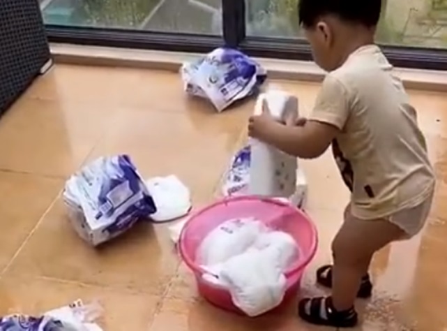 視頻中,爸爸去陽臺查看孩子在干什么。結(jié)果嚇了一跳,寶寶把家里所有紙尿褲都掏出來了,正一批一批放在洗衣機里洗。