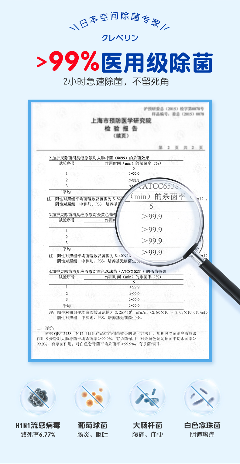 據(jù)權(quán)威第三方檢測(cè)機(jī)構(gòu)報(bào)告顯示,在24小時(shí)內(nèi),加護(hù)靈針對(duì)甲醛、H1N1流感病毒、大腸桿菌、金黃色葡萄球菌及異味等室內(nèi)空氣污染物消除率可達(dá)99%。我國復(fù)旦大學(xué)同加護(hù)靈開展BSL-3實(shí)驗(yàn)項(xiàng)目中,結(jié)果顯示加護(hù)靈可以有效去除空氣中99.9%的H7N9病毒。