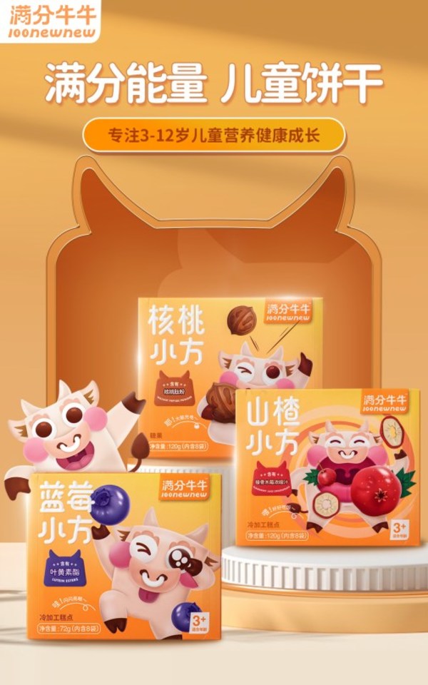 滿分牛牛的第一款產(chǎn)品能量小方,是一款符合“三減三健康”標準的兒童營養(yǎng)餅干。藍莓小方添加葉黃素酯,核桃小方添加專利核桃肽粉,山楂小方添加接骨木莓濃縮汁,幾款營養(yǎng)元素直擊精致媽媽痛點。同時,產(chǎn)品口味專為孩子設計,天然果味,香甜谷物,軟糯蛋白。媽媽們給得放心,寶貝們吃得開心。