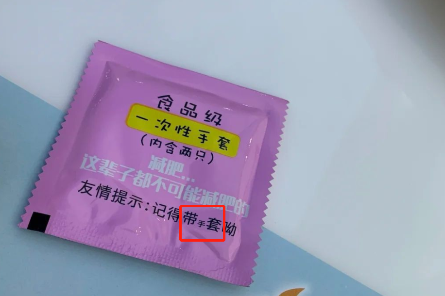 據(jù)小編統(tǒng)計(jì),上述網(wǎng)友抨擊的一次性手套現(xiàn)狀,集中在燒烤、炸雞、小龍蝦等餐飲方面,有堂食有外賣。除了明顯的不當(dāng)言論,令小編驚奇的是,很多手套包裝的形狀都酷似“避孕套”,著實(shí)令人惡心。還有一些商家玩起了“大字疊小字”游戲,把“記得帶手套”中的“手”字故意做的非常小,讓人一眼看去就是“記得帶套”。