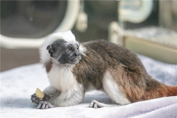 此外,記者還看到萌寶“棉頂狨”猴也是IUCN的極危動物,是今年7月中旬出生強壯健康的雄性寶寶,據悉,“棉頂狨”猴非常容易生出雙胞胎,但這只新生的“棉頂狨”猴個頭太大而只是單胎。