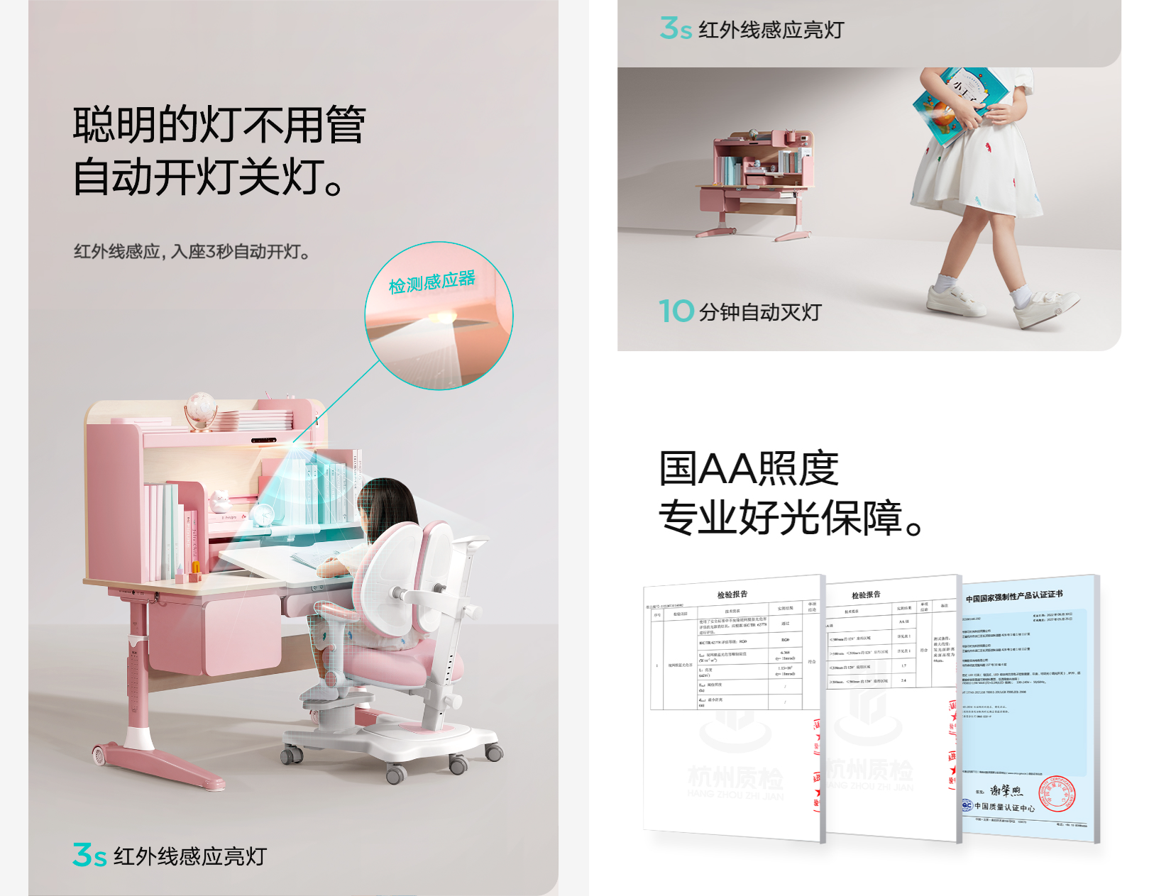 S2結(jié)合智能化感應(yīng)設(shè)施,實現(xiàn)入座自動亮燈,離席自動滅燈的功能。書桌內(nèi)置紅外檢測儀,通過與紅外技術(shù)的聯(lián)動,實時監(jiān)測孩子的動態(tài),檢測孩子入座三秒后,燈源會自動亮起,孩子離開10分鐘后,燈源會自動熄滅。對比傳統(tǒng)手動開關(guān)更省時省力,讓孩子快速進入學(xué)習(xí)狀態(tài)。智能化設(shè)備讓孩子從小體驗智能化生活,開拓孩子想象力~