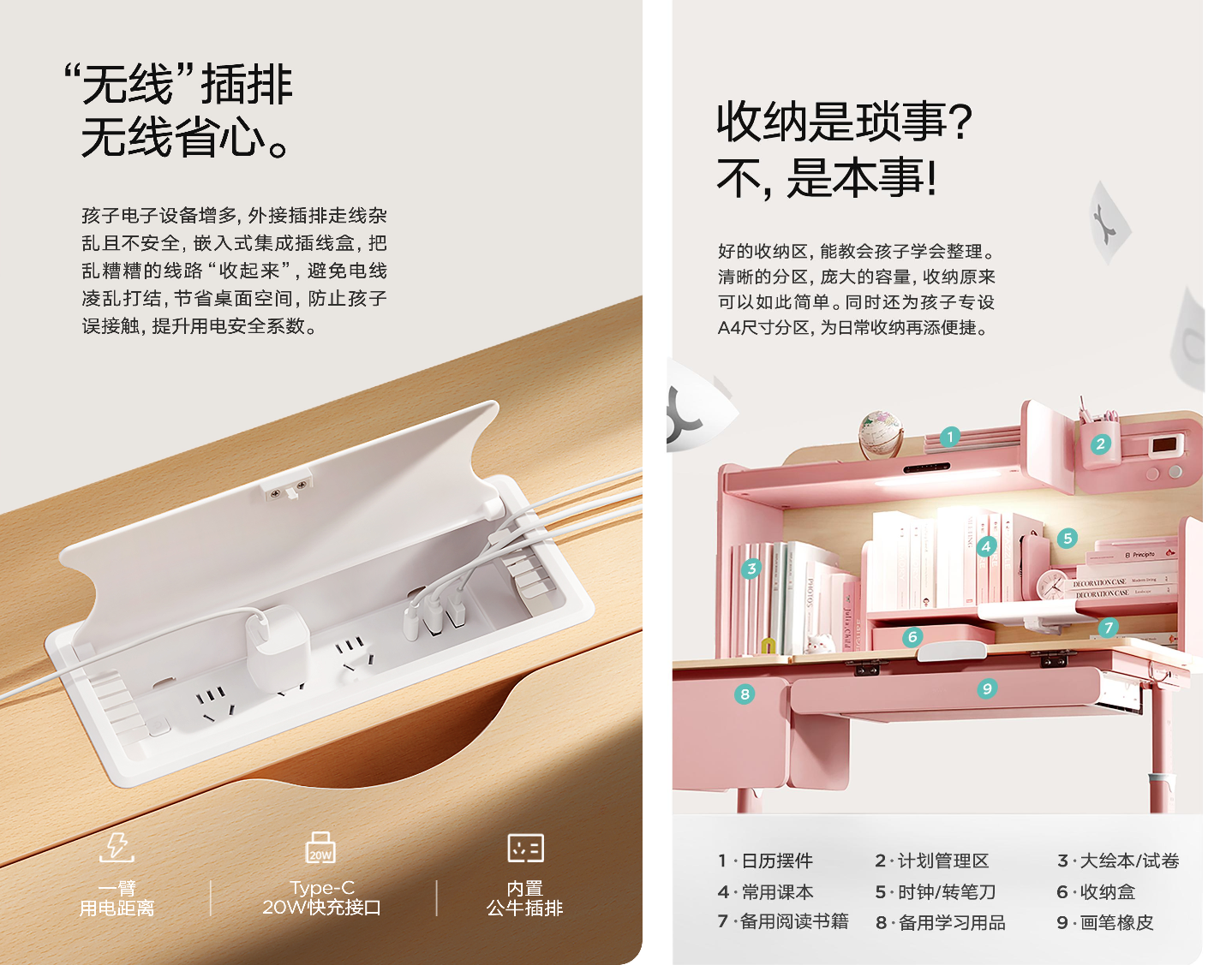 為解決孩子圖書資料多的問題,黑白調(diào)合理運用書桌空間,研發(fā)設(shè)計了強收納功能,書桌多區(qū)域劃分,設(shè)立A4大繪本存放區(qū)、常用課本存放區(qū)、玩具文具存放區(qū),抽屜也多功能劃分,便于畫筆文具分開存放整理。強大收納,感光護眼學(xué)習(xí)桌具有強大收納功能,實測可放200本書,A4大繪本也能輕松放。解決孩子成長過程中書本多、文具多的問題。收納分區(qū)設(shè)計實現(xiàn)物品分類收納,從小鍛煉孩子自理能力。