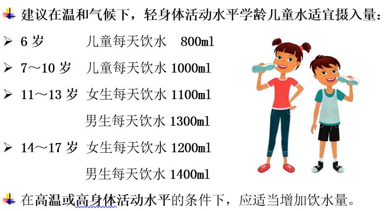 人體水的攝入和排出維持著動態(tài)平衡,飲水過多或過少都不利于身體健康?!吨袊用裆攀碃I養(yǎng)素參考攝入量(2013版)》制定了我國6~17歲學(xué)齡兒童水適宜攝入量: