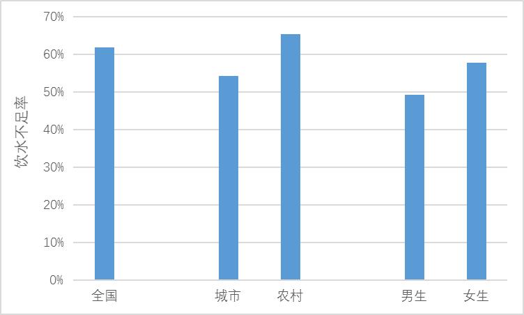《2015-2017年中國居民營養(yǎng)與健康狀況監(jiān)測報告》顯示,我國7~17歲學(xué)齡兒童飲水不足率高達57.8%, 其中城市和農(nóng)村兒童分別是49.2%和65.4%;男生女生分別是54.3%和61.8%。