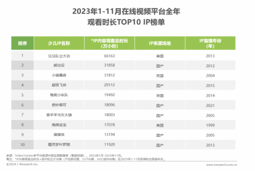 2023年,優(yōu)酷少兒在這一領(lǐng)域解鎖了頭部IP的合作新姿勢(shì)。早在《汪汪隊(duì)立大功第九季》上線之際,優(yōu)酷少兒就量身打造了“虛擬+實(shí)物”權(quán)益以及獨(dú)家定制的線下體驗(yàn)等差異化玩法,助力汪汪隊(duì)新季破圈。據(jù)艾瑞統(tǒng)計(jì)的2023年1月至11月IP觀看時(shí)長(zhǎng)榜單數(shù)據(jù)顯示,《汪汪隊(duì)立大功》在累計(jì)觀看時(shí)長(zhǎng)上排名第一。