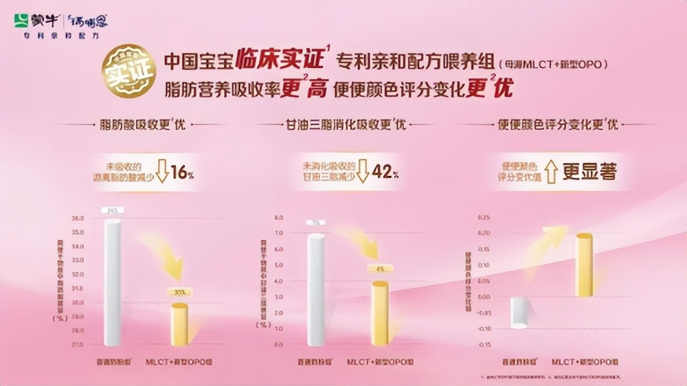 據(jù)實(shí)證數(shù)據(jù)顯示,相比于對(duì)照奶粉喂養(yǎng)組,親和配方組的寶寶未吸收的游離脂肪酸減少了16%,未消化吸收的甘油三酯減少了42%,寶寶便便顏色評(píng)分也更優(yōu)……可以看出,“MLCT+新型OPO”專利親和配方[1]組的寶寶比對(duì)照奶粉喂養(yǎng)組的寶寶對(duì)脂質(zhì)消化吸收率明顯更高!