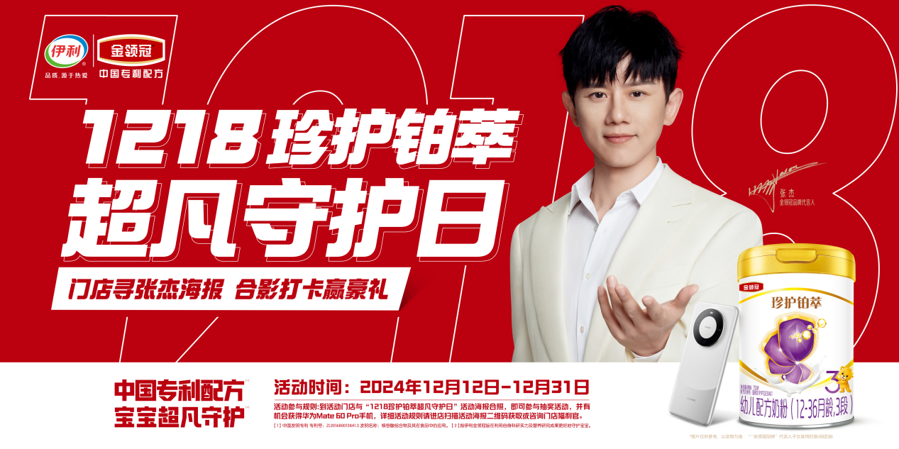 12月12日至31日期間,消費者到指定門店掃描金領冠“1218珍護鉑萃超凡守護日”活動海報二維碼,與金領冠品牌代言人張杰專屬海報合照打卡,即有機會贏取華為Mate 60 pro手機、美的戶外燒烤爐、Babycare多功能籃球架等驚喜好禮。
