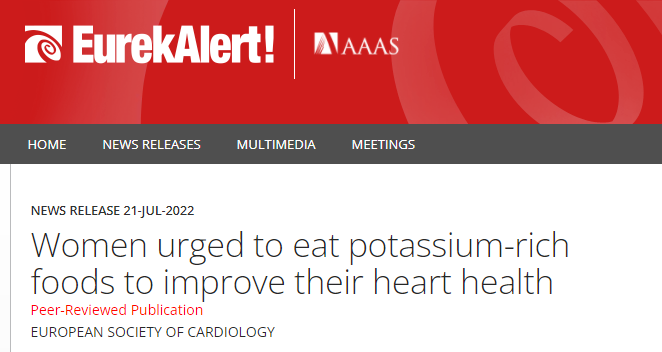 研究顯示,在近20年的隨訪期間,與鉀攝入量最低者相比,鉀攝入量最高者,心血管事件風(fēng)險(xiǎn)降低了13%。女性心血管病發(fā)生或復(fù)發(fā)風(fēng)險(xiǎn)降低了11%,男性降低了7%。