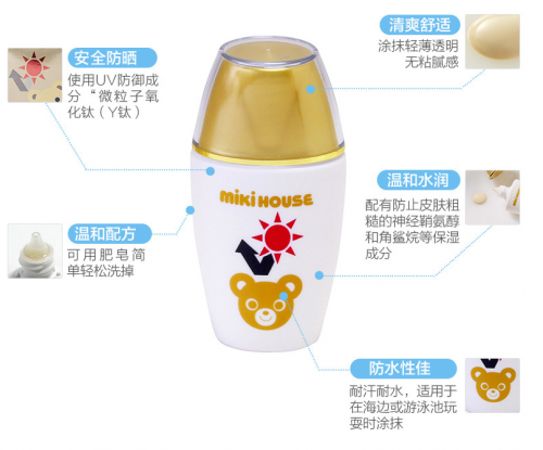 MIKI HOUSE UV防曬乳即使是薄涂也能防御99%以上的有害紫外線。使用UV防御成分“微粒子氧化鈦(Y鈦)”,對(duì)皮膚刺激很小,涂抹后不發(fā)熱。用香皂即可簡(jiǎn)單卸掉,是一款非常方便的寶寶防曬。