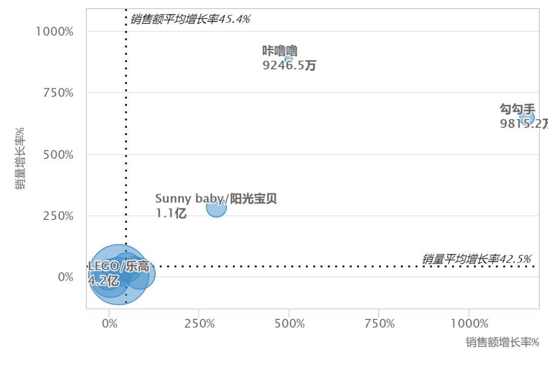 數據顯示,LEGO/樂高、LDCX/靈動創(chuàng)想、disney/迪士尼、KUB/可優(yōu)比、育兒寶品牌銷量和銷售額穩(wěn)定增長;咔嚕嚕、勾勾手銷售額、銷量增速驚人;Sunny baby/陽光寶貝銷售額增速放緩。