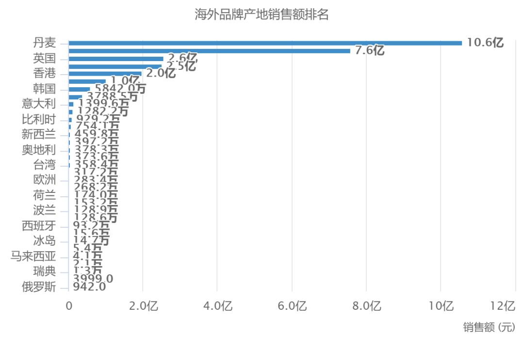 線上海外品牌玩具產地呈頭部現象,約12.1%的頭部產地貢獻了約83.0%的海外品牌銷售額。