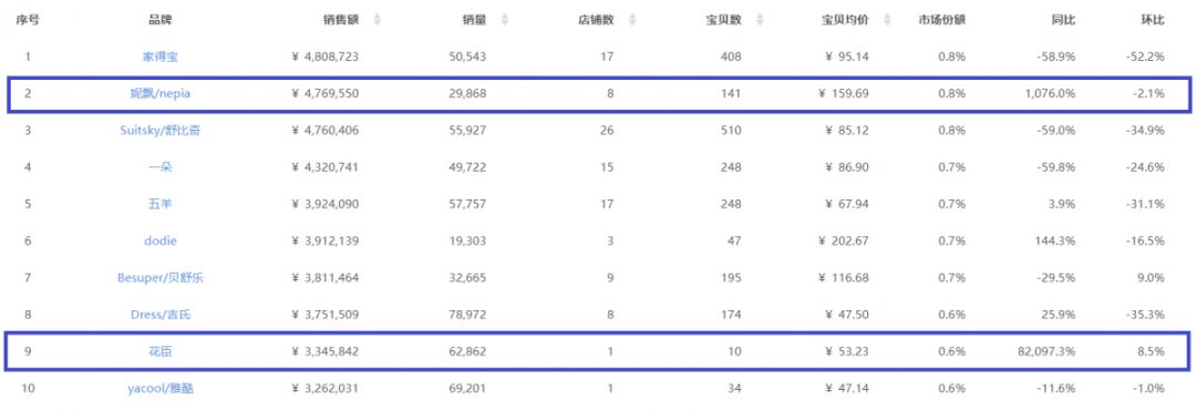 在一片負(fù)增長(zhǎng)中,有幾個(gè)品牌卻依然保持正向增長(zhǎng),如moony、露安適、巴布豆、妮飄/nepia、dodie、五羊、花臣、子初等,其中妮飄和花臣增速驚人,不得不提。母嬰研究院數(shù)據(jù)顯示,9月份,妮飄同比增長(zhǎng)1,076.0%,花臣同比增長(zhǎng)82,097.3%。