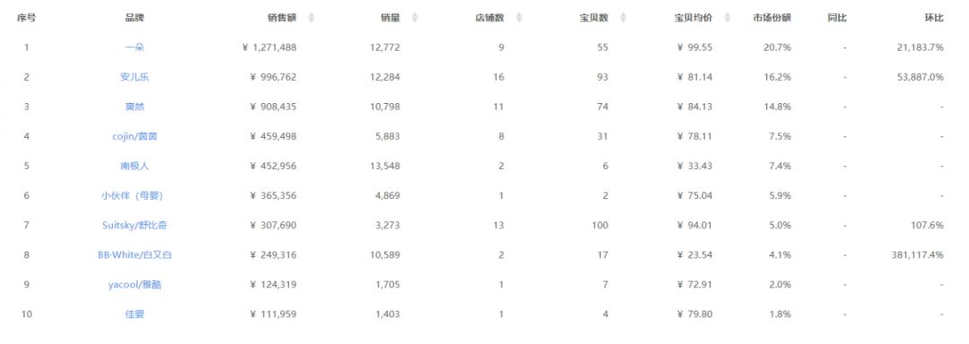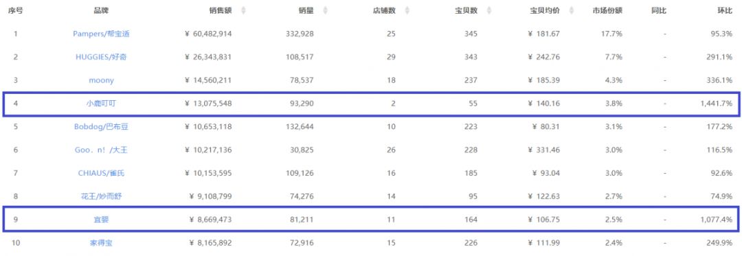 近年來(lái),紙尿褲和拉拉褲迅速發(fā)展,紙尿片在嬰童尿褲中占比越來(lái)越少,很多人基本忽略了這一品類(lèi),但令人意外的是,天貓平臺(tái)紙尿片環(huán)比增速高達(dá)1,588.6%,其中一朵環(huán)比增長(zhǎng)21,183.7%,安兒樂(lè)53,887.0%,BB·White/白又白則達(dá)到了381,117.4%。