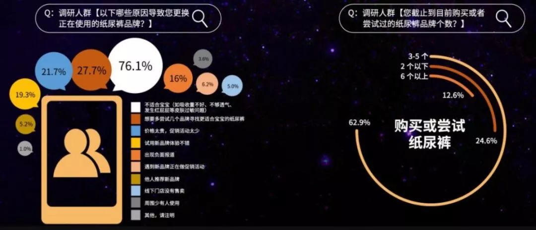 品牌忠誠度不高。作為剛需、高頻的快速消費品,紙尿褲的品牌忠誠度相對于其他母嬰用品來說是最低的。育兒網(wǎng)發(fā)布的2019《洞悉紙尿褲行業(yè)“人貨場”最新變革》報告顯示,近8成媽媽會因為紙尿褲不適合寶寶而更換紙尿褲品牌,近3成媽媽想多嘗試其他品牌;調查中,有8成消費者購買或嘗試過至少三個品牌,6個以上品牌占到12.6%。