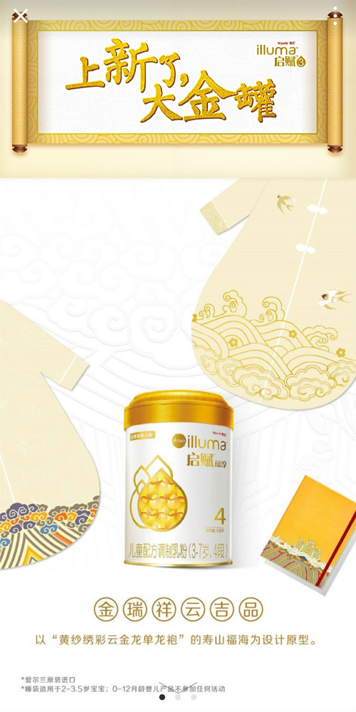據(jù)惠氏媽媽俱樂部介紹,啟賦聯(lián)合故宮文化服務(wù)中心,推出了宮廷專屬禮,購買指定啟賦atwo大金罐即可獲得靈感源于清乾隆霽青金彩海晏河清尊的金彩海晏睡袋,限量10000份。各位寶媽奶爸可以通過惠氏媽媽俱樂部或門下實(shí)體店參與,get寶寶的宮廷專屬禮。
