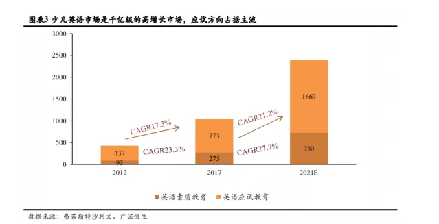 在市場方面,據(jù)弗若斯特沙利文統(tǒng)計,青少兒英語培訓賽道(3-18歲)2017年市場規(guī)模約1050億,對應2012-2017過去5年復合增速達19%,預期2021年市場規(guī)模接近 2400億。在少兒英語市場中,應試方向雖然占據(jù)主流,但英語素質方向占比在逐步提升。從全國的維度來看,中國青少年英語培訓市場的前三大供應商為英孚少兒,泡泡少兒 和瑞思英語,合計占市場份額的 3.6%,可見這個市場還有很多機會。對于線下英語培訓機構來講,未來可依托自己線下的流量,下沉市場,拓展自己的業(yè)務來應對市場的變化。