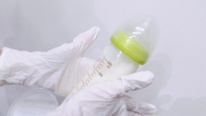將奶粉揉搓過(guò)后的奶液倒入玻璃杯時(shí),奶粉呈現(xiàn)乳白色,溶液比較均勻,但底部仍然有少許糊狀物質(zhì)。