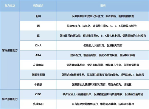 常規(guī)強(qiáng)化配方是指在國(guó)標(biāo)中沒(méi)有硬性規(guī)定,但是大多數(shù)品牌都會(huì)選擇添加的營(yíng)養(yǎng)物質(zhì),從營(yíng)養(yǎng)成分表中可以看出,高培迪唯恩添加了8種常規(guī)強(qiáng)化配方,包括:硒、錳、膽堿、?;撬帷⒆笮鈮A、DHA、ARA、低聚半乳糖。