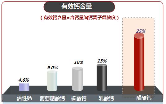 經(jīng)口攝入的鈣物質(zhì)必須要以鈣離子的形式才能被身體吸收,所以鈣制劑的溶解度越高,也就是說能夠被人體吸收的鈣離子越多。金丐醋酸鈣相比磷酸氫鈣、碳酸鈣、乳酸鈣等來說,溶解度極高,每100ml水中可溶解34700mg,有效含鈣量高達(dá)25%。相比碳酸鈣每100ml水中僅可溶解1.5mg,金丐醋酸鈣是溶解度最高的鈣,被人體吸收的鈣離子越多,效果更加顯著。