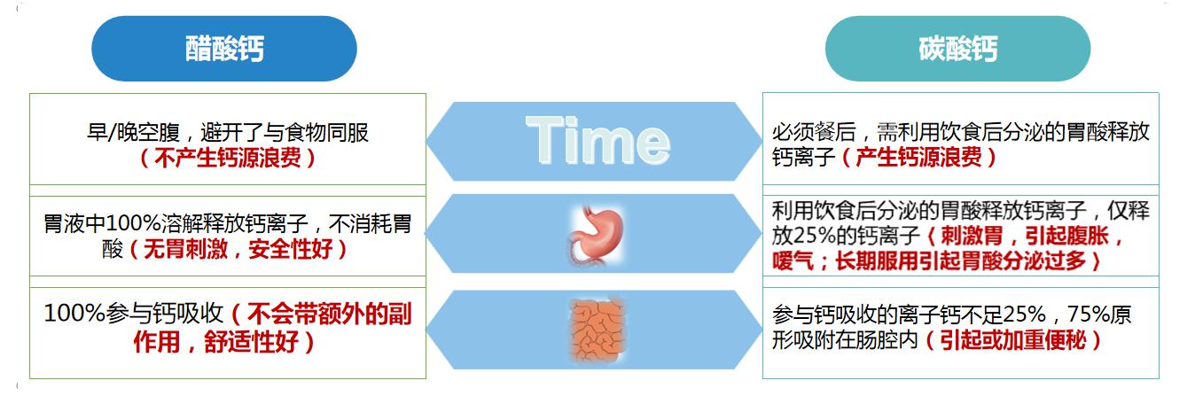 雖說碳酸鈣和醋酸鈣僅有一字之差,但是兩者的差距可就大了。經(jīng)口攝入的鈣物質(zhì)必須要以鈣離子的形式才能被身體吸收,鈣制劑的溶解度更高,能夠被人體吸收的鈣離子越多。市面中大部分鈣制劑是碳酸鈣,屬于無機(jī)鈣的一種。大多水溶性較差,每100ml水中僅可溶解1.5mg,碳酸鈣一般需要在餐后服用,需利用飲食后分泌的胃酸釋放鈣離子,不僅會產(chǎn)生鈣源浪費(fèi),還容易造成患者打嗝、噯氣等不良反應(yīng),補(bǔ)鈣效果不佳。