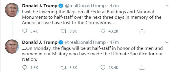 “在接下來的3天里,所有聯邦(機構)的建筑和國家紀念碑將降半旗,紀念我們在新冠疫情中失去的美國人。下周一,將降半旗向為我們國家做出無盡犧牲的軍人們致敬。”特朗普在推特上寫道。