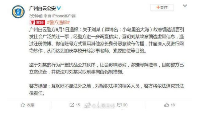 廣州白云警方6月1日通報:關(guān)于劉某(微博名:小島里的大海)故意編造謊言引發(fā)社會廣泛關(guān)注一事,經(jīng)警方進一步調(diào)查核實,查明劉某故意編造虛假信息,通過注冊微博、微信賬號方式冒用其他家長身份惡意散布傳播,并雇請人員進行網(wǎng)絡(luò)炒作,從而達到迫使學校開除涉事老師、索要賠償?shù)饶康摹?/p>