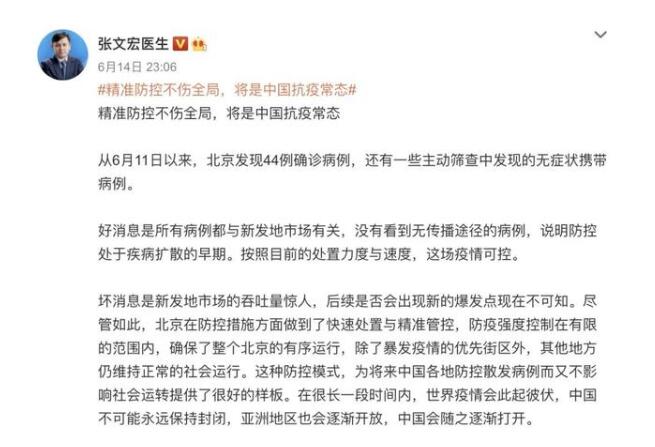 6月11日0時-6月14日7時,北京共出現(xiàn)51例確診病例,均與新發(fā)地市場有關(guān)聯(lián)。14日晚11時許,上海復(fù)旦大學(xué)附屬華山醫(yī)院感染科主任張文宏就此事發(fā)表評論。他認(rèn)為,精準(zhǔn)防控不傷全局,將是中國抗疫常態(tài)。