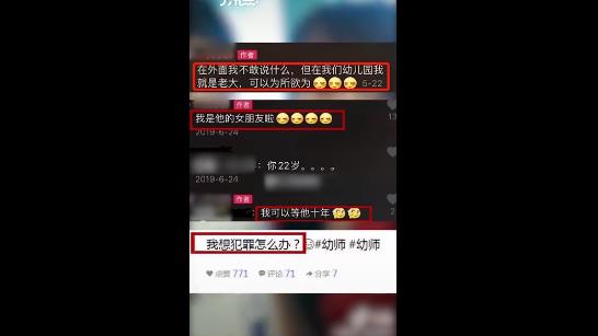 通報稱,近期,唐河縣一幼兒園女教師在社交網(wǎng)絡(luò)平臺上傳與男童親吻的視頻,并配發(fā)“我想犯罪怎么辦?女朋友在此,我可以等他十年”等言論的圖文信息,引起網(wǎng)民熱議。